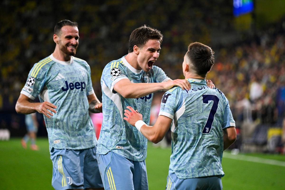 Francisco Conceiçao festeggiato dopo il gol in Villarreal Juventus (Foto ANSA)