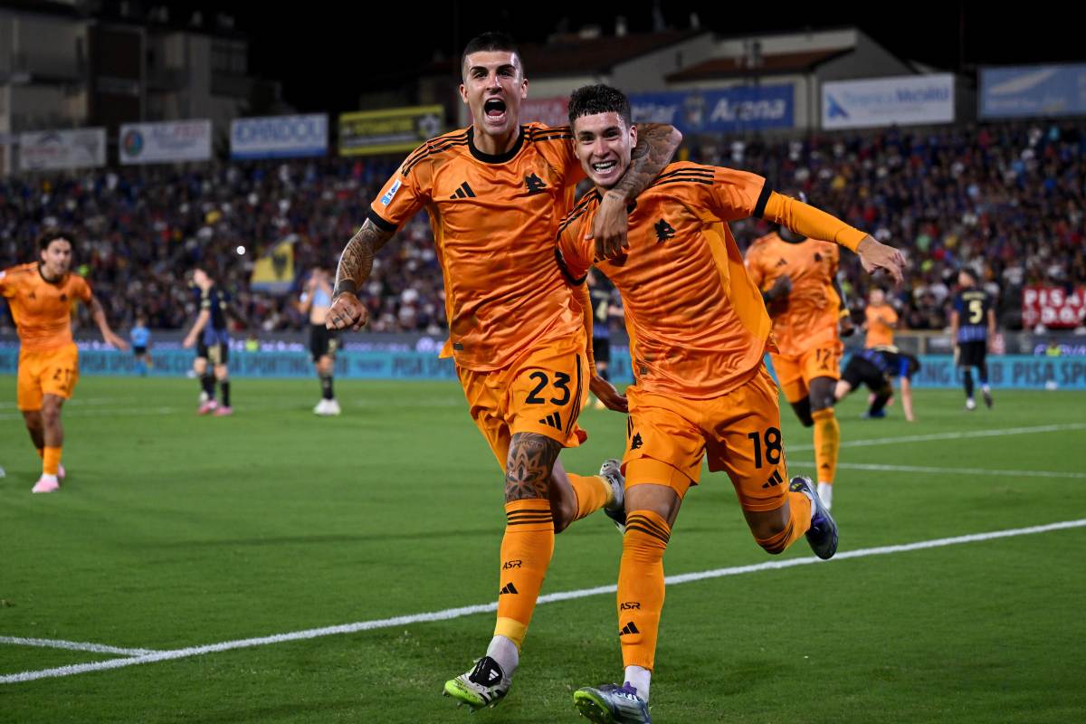 Matias Soulé e Gianluca Mancini esultano con la Roma (Foto ANSA)