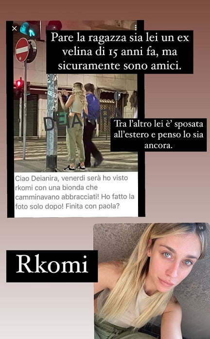 È l’esperta di gossip Deianira Marzano a pubblicare nelle ultime ore la segnalazione di una follower che vede Rkomi in compagnia di una bella donna che non è però Paola Di Benedetto.