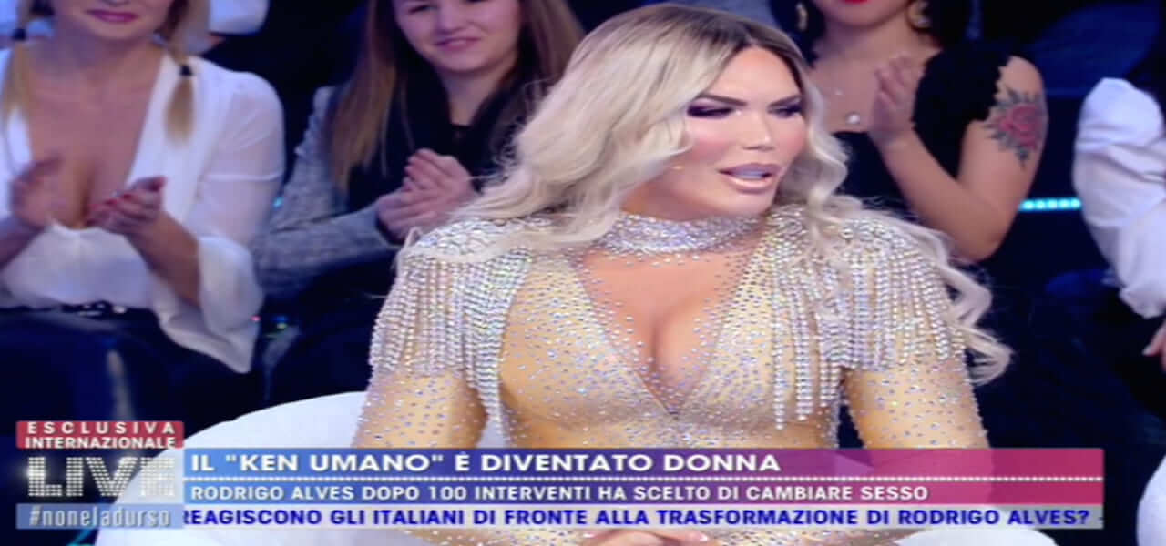 Rodrigo Alves è uno degli ospiti speciali di Live – Non è la d’Urso per parlare della sua decisione di trasformare il suo corpo da Ken Umano a Barbie Umana. È già una lei, una decisione che ultimamente ha fatto discutere diversi giornali. Fa il suo ingresso in un abito succinto color oro scintillante, tacchi a spillo e capelli lunghissimi e biondi, che le cadono lungo tutta la schiena. “Mi dovete chiamare ancora Rodrigo, a cambierò il mio nome presto”. Arrivano subito i commenti di Roberto Alessi: “Sfila meglio di Claudia Shiffer”. Barbara le propone di rifare la sua sfilata spumeggiante, tanto amata dal pubblico di Live. Il professor Lorenzetti è sotto choc: “Sto ammirando questo capolavoro e non sono ironico, è bellissima”. Ha fatto diverse operazioni: “Sono molto emozionato e amo tanto questo paese. Mi hanno messo il sedere e mi hanno tolto gli addominali finti”. Rodrigo si commuove in diretta: “Non mi piace vedere le foto di com’ero prima, io sono nato una donna, ho fatto tutto quegli interventi per trovare una felicità. Sono nato con una disfunzione ormonale e ho provato di tutto per essere un maschio, un corpo di un uomo”. Poi la rivelazione: “Le persone che mi chiamano Ken umano non sanno che invece io non volevo”. (agg. Chiara Greco)