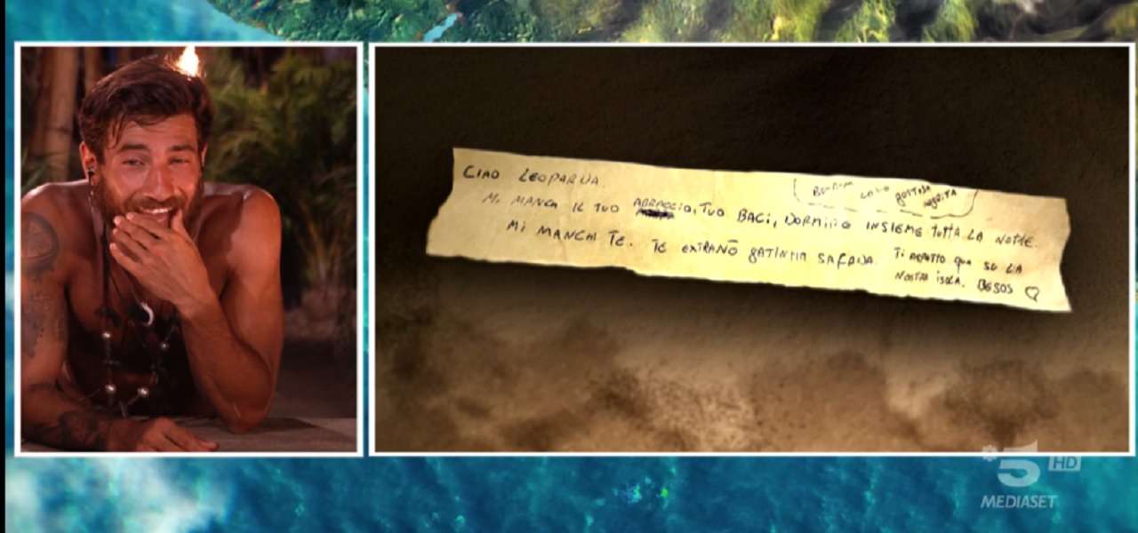 “Io so tutto, devono dirmi tutto sull’Isola, io ho un patto! – ammette Ilary Blasi in diretta, per poi graziare il naufrago – Quindi Roger non fare il furbo, per questa volta la passi liscia, perché l’amore vince su tutto, quindi va bene così, anzi, faremo arrivare il tuo messaggio a Estefania!” Va dunque in onda anche l’immagine del biglietto incriminato che recita: “Ciao Leoparda, mi mancano i tuoi abbracci, i tuoi baci, dormire insieme tutta la notte, mi manchi te. Ti aspetto qua sulla nostra isola!”