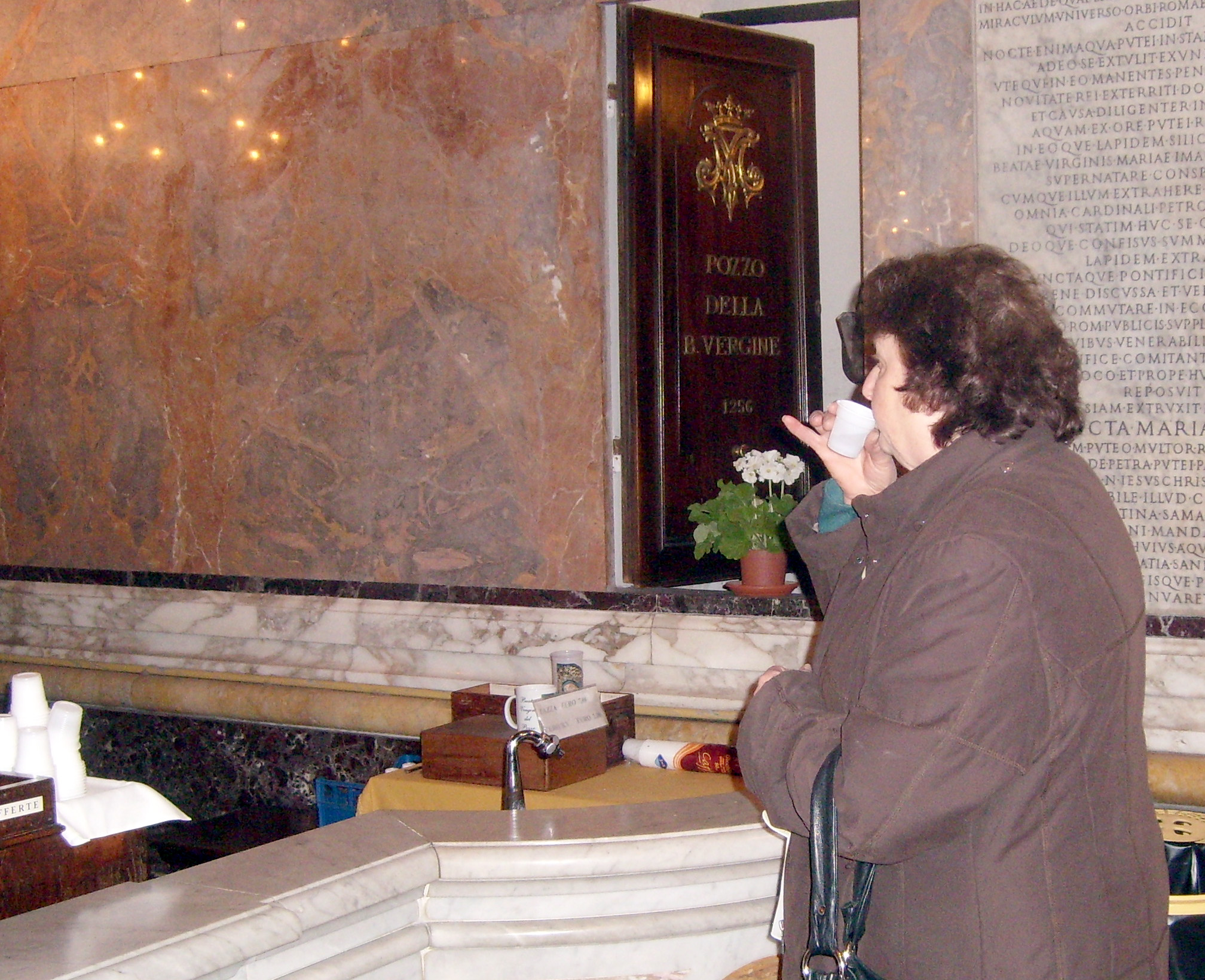 «Quando mi hanno diagnosticato un tumore, volevo partire per Lourdes, ma la mia situazione economica non me lo permetteva. Una notte ho sognato una voce, che mi diceva di andare dalla Madonna del Pozzo. Non sapevo cosa fosse, ho cercato su Internet e ho scoperto non solo che esisteva, ma che viene chiamata la piccola Lourdes di Roma». Roberta, una mamma romana di 47 anni, non trattiene le lacrime, nel raccontare la grazia del suo incontro con la Madonna del Pozzo, di come – bevuta l’acqua dalla fonte miracolosa – abbia avuto un immediato beneficio, non solo fisico, riconosciuto con stupore anche dal suo medico. Roberta sta ancora lottando contro la malattia, ma con una energia nuova, che le sgorga dalla certezza di avere una dolce e potente compagna di strada. In ginocchio, ai piedi della Madonna del Pozzo, in una normale mattina di febbraio, con Roberta non si ferma il flusso silenzioso di pellegrini. Ciascuno sussurra le sue pene e i suoi dolori alla Madonna, bevendo un bicchierino di acqua che sgorga da un piccolo rubinetto, che attinge da un pozzo che dispensa grazie da più di otto secoli.