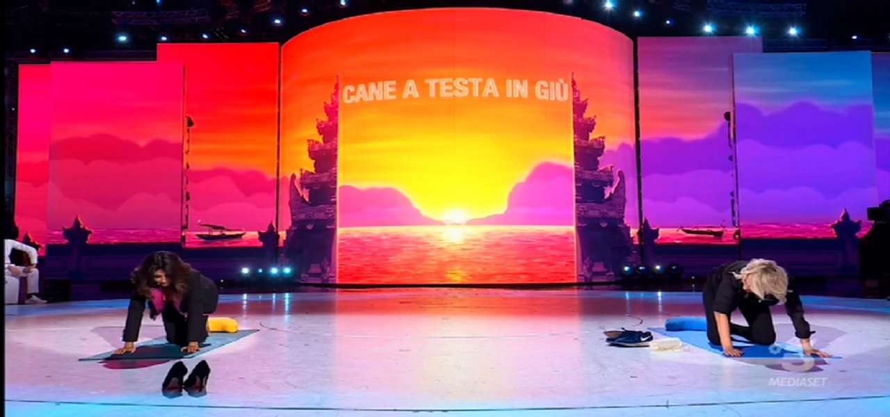 Maria De Filippi cerca di evitare la prova ma alla fine è costretta ad accettare la richiesta di Sabrina Ferilli. “Sei a posto o sei trasandata come sempre nelle parti che non si vedono?” la stuzzica l’attrice, poi viene richiamata da una voce “fantasma” che le invita ad emulare la posizione del “muso di vacca”. Battutine e risate tra le due amiche non mancano, soprattutto quando poi arriva la posizione del “cane a testa in giù”: “Eh si, questa poi è da ricordare! Davvero una bella posizione”, scherza infine la Ferilli.