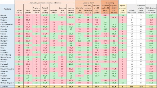 Tabella 1. Alcuni indicatori che misurano le abitudini di vita, i comportamenti, l’ambiente, le vaccinazioni; gli screening oncologici. Dati relativi all’anno più recente. Fonte Eurostat. In verde i valori migliori della media, in rosso i valori peggiori della media.
