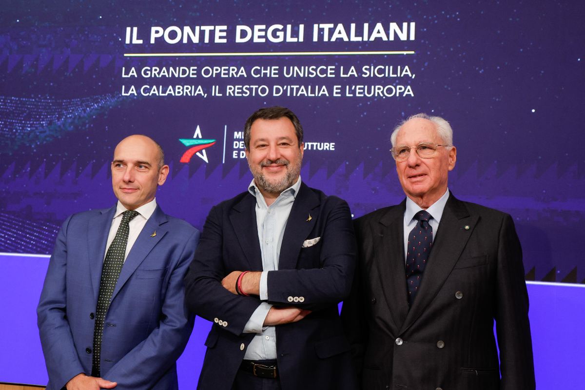 Ponte sullo Stretto, Salvini con il viceministro Morelli e l'ad Pietro Ciucci (ANSA 2025, Giuseppe Lami)