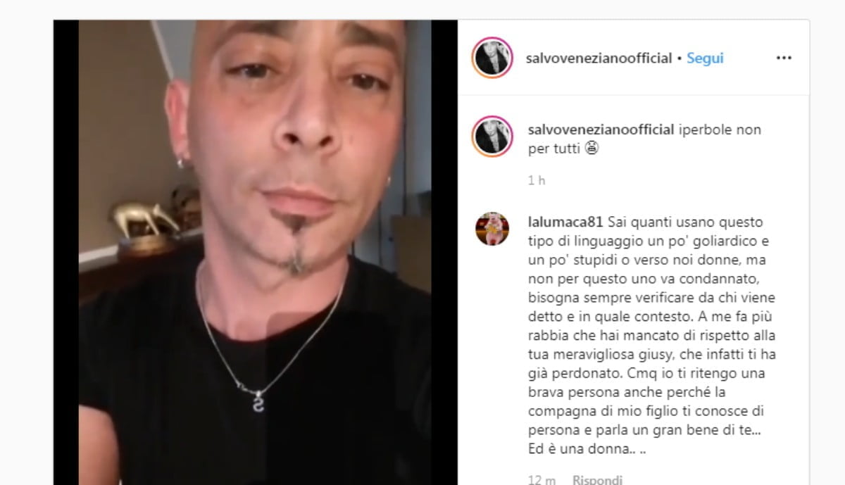 Nel corso della puntata serale di ieri del Grande Fratello, l’opinionista Pupo si è così schierato dalla parte di Salvo: “Vedere questa sera Pupo difendermi è stato davvero una gioia – ha proseguito il 2re delle pizze” – ha preso la mia difesa ma come avete visto tutti non gli è stato permesso, gli hanno messo un tappo in bocca, quindi grazie Pupo”. Poi Veneziano ha concluso il suo filmato di sfogo così: “Ricordatevi questa parola, iperbole, non è per tutti però, è solo per qualcuno. Per gli altri non è iperbole, per gli altri è femminicidio, scannare è femminicidio. Grazie Pupo, buonanotte”. Il video ha toccato in poco tempo 2000 visualizzazioni ed ha ricevuto numerosi commenti, fra chi lo difende e chi invece lo accusa.