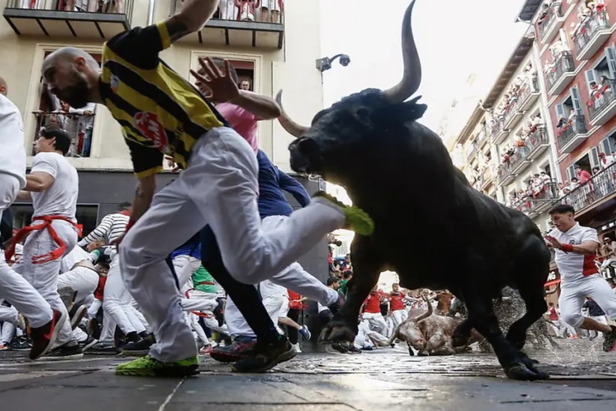 Si tratta delle corse dei tori per le strette strade di Pamplona, con gli animali liberati dal recinto di Santo Domingo che corrono verso l’arena, letteralmente circondati da persone che corrono pericolosamente tra di loro.
