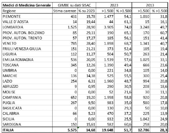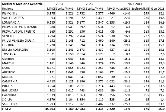 A livello nazionale nel 2013 i MMG erano poco più di 45.000 (tabella 1) e sono diventati nel 2023 circa 38.000, con una perdita secca di oltre 7.000 professionisti (-16%), differenza tra chi è uscito (cambio lavoro, pensione, decesso) e chi è entrato.