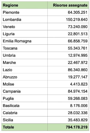 La tabella è la seguente (il riparto tra Regioni è effettuato in base alla popolazione residente alla data del 1 gennaio 2022):