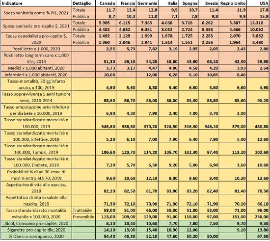 Il dossier non presenta una valutazione complessiva o di insieme, anche se dai dati di tabella e dai commenti sui singoli indicatori emerge che Italia e Spagna spendono meno degli altri Paesi, hanno più medici e meno infermieri rispetto agli altri, hanno esiti migliori per diverse patologie, una mortalità generale più bassa e una attesa di vita alla nascita più alta, delle abitudini di vita più sane (meno alcol e meno fumo).