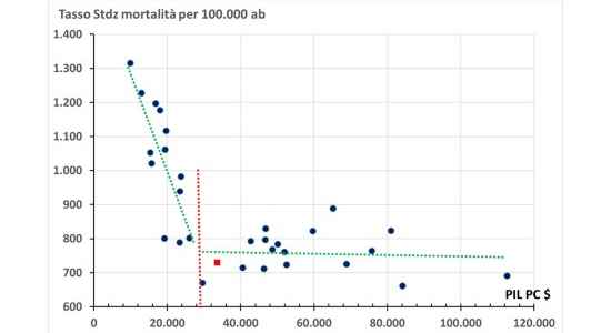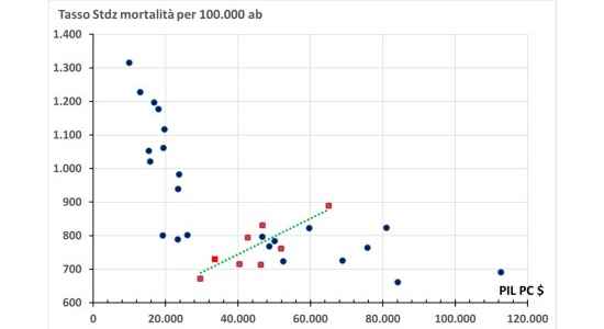 Meglio approfondire. Innanzitutto, poiché la spesa sanitaria pro-capite non è di per sé un indicatore di ricchezza, si è andati alla ricerca del Pil (Prodotto lnterno lordo) pro-capite, indicatore sicuramente più adeguato, ma per le nazioni considerate nel dossier il risultato non è cambiato: relazione ancora lineare tra maggiore ricchezza e maggiore mortalità. Il sospetto aumenta, ma anche la voglia di approfondire: come? Forse che il risultato dipende dalla scelta delle nazioni?