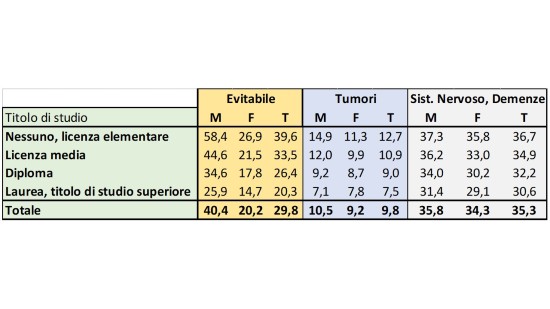 Il titolo di studio, preso come indicatore dello stato socioeconomico, fa quindi la differenza per quanto riguarda gli esiti di salute (mortalità evitabile e per specifiche patologie): più alto è il livello di istruzione e migliori sono gli esiti di salute che si sperimentano. Non è il basso titolo di studio di per sé che causa la maggiore mortalità, ma è ciò che il basso titolo di studio si porta dietro in termini di diffusione di stili di vita meno salutari, di maggiore esposizione a fattori di rischio ambientali e comportamentali, nonché di assistenza sanitaria meno adeguata e accessibile. Il gap tra le due classi di titolo di studio più estreme è molto elevato (il doppio di mortalità, anche se non per tutte le patologie) e vede i maschi in posizione più sfavorevole rispetto alle femmine, sia per quanto riguarda le patologie legate agli stili di vita ed ai fattori di rischio ambientali e comportamentali (mortalità prevenibile) sia per le patologie legate invece alla accessibilità ed adeguatezza della assistenza sanitaria (mortalità trattabile).