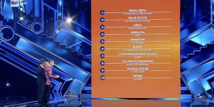 Annunciata anche la classifica generale, di cui vi riportiamo la top ten, dal decimo al primo posto: Noemi, Malika Ayane, Colapesce Dimartino, La Rappresentante di Lista, Irama, Maneskin, Annalisa, Arisa, Willie Peyote, Ermal Meta. Domani l’ultimo atto di una kermesse che non smette di regalare sorprese e che incoronerà il vincitore della settantunesima edizione del Festival di Sanremo. (aggiornamento di Alessandro Nidi)
