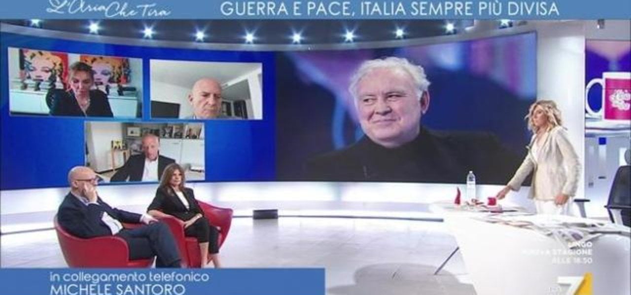Caos a L’Aria che tira con lo scontro acceso in diretta tv tra Michele Santoro e la conduttrice Myrta Merlino. La “colpa” del programma è stata quella di mandare in onda un servizio che raccontava due piazze, dichiaratamente distinte tra loro. La prima era quella convocata per la Giornata della Vittoria, quindi filo-russa, l’altra invece era arcobaleno, convocata dallo stesso Santoro sotto il nome “Staffetta per la pace“, col giornalista che chiedeva al Parlamento europeo di intervenire per un cessate il fuoco (perché non alla Duma?).