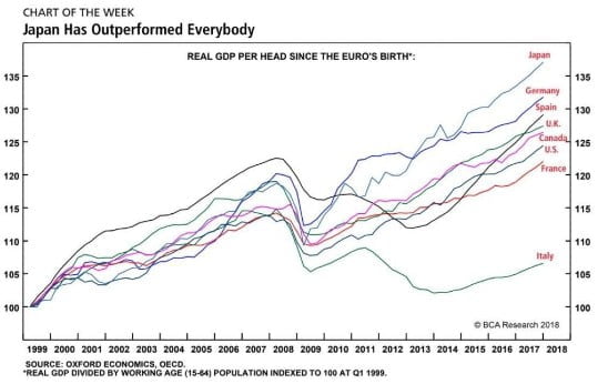 Se parliamo di ciò che conta, cioè del prodotto interno reale per popolazione in età lavorativa, il Sol Levante in realtà ha fatto meglio di tutti i Paesi industrializzati. Se l’obiettivo è aumentare la produttività, un Paese con piena o quasi occupazione cresce più lentamente. Il Kenya cresce mediamente dell’8% annuo, contro l’1% del Giappone, ma appunto perché il Giappone è già sviluppato. Conta il 2,5% di disoccupazione e salari in crescita costante; il giapponese medio percepisce ad ogni cambio lavorativo quasi il 10% in più di aumento.