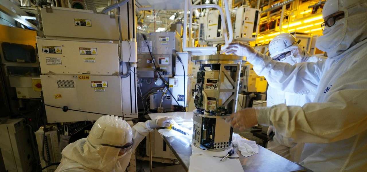 Tecnici al lavoro su apparecchi che montano chip (LaPresse)