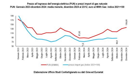Sono diffusi tra le imprese della manifattura i timori che le tensioni geopolitiche possano impattare sui prezzi delle I dazi annunciati dagli Stati Uniti possono rallentarci, calo del 16,8% dell’export totale dell’Italia verso gli USA (se dazi addizionali del 20%). A dicembre 2024 scende il clima di fiducia delle imprese manifatturiere e peggiorano le attese sugli ordini. Nel corso del 2024 i prezzi dell’energia hanno manifestato preoccupanti spinte al rialzo. Ad ottobre i prezzi all’import di gas naturale salgono del 21,5% dai minimi dello scorso marzo, mentre il prezzo all’ingrosso dell’energia elettrica a dicembre (media al 22/12) è salito del 56% dal minimo di febbraio 2024.