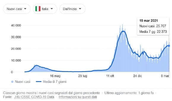 Figura 1. Nuovi casi di contagio (e media calcolata su 7 giorni) in Italia (Fonte: JHU CSSE COVID-19 Data)