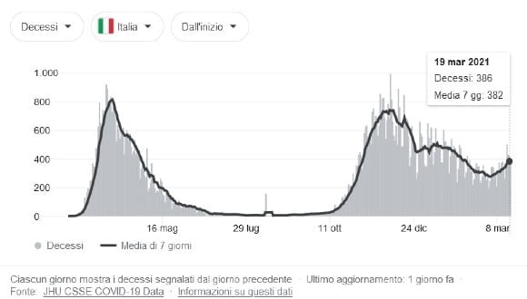 Figura 2. Numero di decessi (e media calcolata su 7 giorni) in Italia (Fonte: JHU CSSE COVID-19 Data)