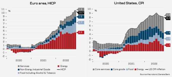 E ce lo mostra plasticamente questo grafico: Fed e Bce non stanno combattendo lo stesso tipo di inflazione, poiché il peso della componente energetica non è il medesimo. Gli Stati Uniti quindi possono permettersi, pur calmierando con attenzione le reazioni del mercato sulla liquidità, una dipendenza pressoché totale dalla leva storica dei tassi per contrastare l’aumento dei prezzi. Mentre Francoforte non può sperare di operare un off-setting di dinamiche energy-driven unicamente operando sul costo del denaro. Anzi, così facendo rischia appunto l’effetto contrario, il testacoda.