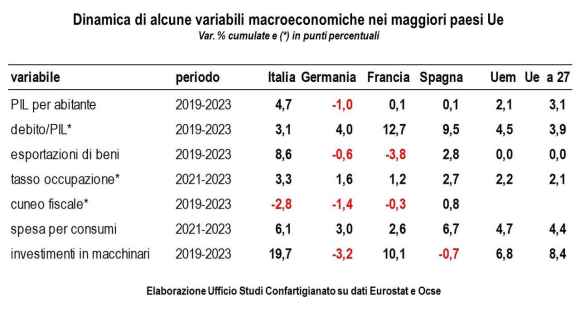 I risultati – Vediamo nel dettaglio alcune delle performance del sistema delle imprese e dell’economia italiana in questi ultimi anni. Tra il 2019 e il 2023 il Pil pro capite in termini reali in Italia ha cumulato un aumento del 4,7%, un ritmo più che doppio del +2,1% dell’Eurozona, e mostrando una marcia in più rispetto al ristagno di Francia e Spagna (+0,1%) e alla flessione della Germania (-1,0%). Nonostante la politica monetaria abbia penalizzato la spesa per interessi del bilancio italiano, la più alta nel continente europeo, la crescita economica ha contenuto la dinamica del peso del debito pubblico: negli ultimi quattro anni il rapporto debito/Pil è salito di 4,5 punti nell’Eurozona, di 12,7 punti in Francia, di 9,5 punti in Spagna, ma solo di 3,1 punti in Italia, che ha fatto meglio della virtuosa Germania (+4 punti).