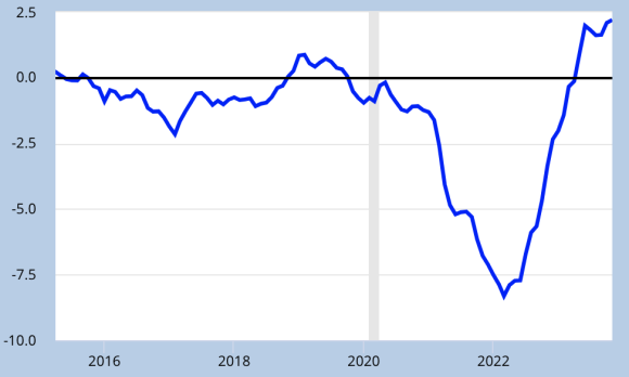 Infine, è essenziale tenere monitorata la crescita dei salari nominali americani, i quali si sono attestati al 4% annuale a novembre 2023, di gran lunga maggiore rispetto al tasso annuale d’inflazione del 3,1%. Anche i tassi d’interesse reali (tassi federali nominali al netto dell’inflazione) andranno seguiti attentamente, i quali son tornati in territorio positivo da maggio 2023 e attualmente hanno raggiunto il 2,2% circa come si evince dal grafico sottostante.