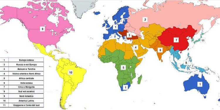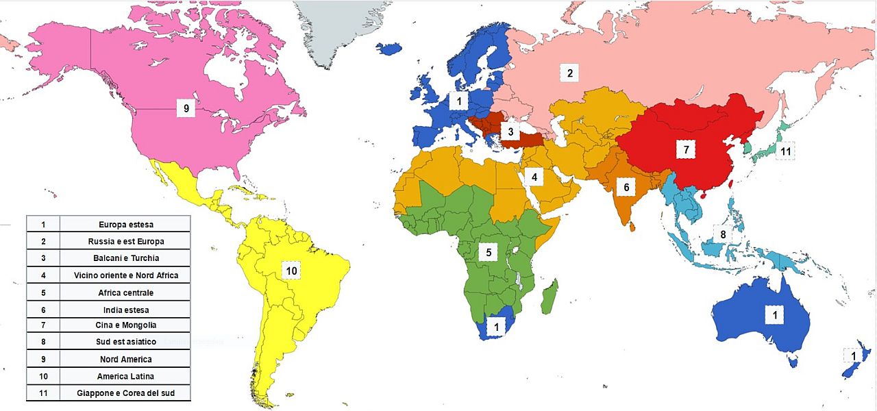 La mappa del globo rappresentata in apertura, con diverse colorazioni, mostra la collocazione geografica delle undici Aree.