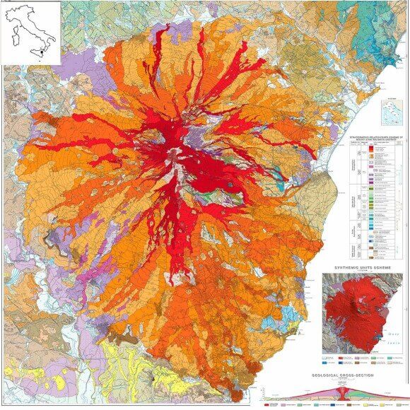 Carta geologica dell’Etna (S. Branca, M. Coltelli, G. Groppelli & F. Lentini, “Geological map of Etna volcano”, 1:50,000 scale, in «Italian Journal of Geosciences», vol. 130, n. 3, pp. 265-291, (2011). doi: 10.3301/IJG.2011.15.)