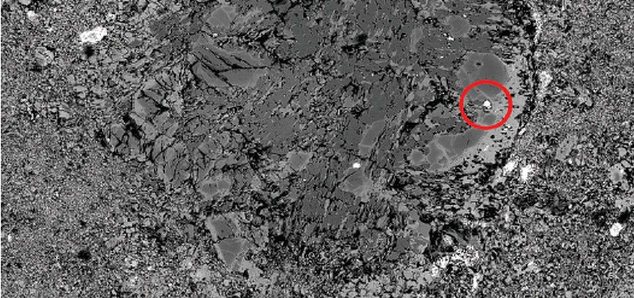 Immagine al microscopio SEM di un frammento della meteorite Khatyrka; nel cerchio rosso un frammento di lega a rame e alluminio.