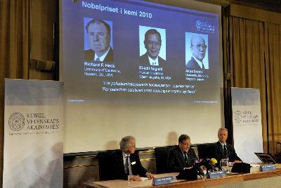 Il premio Nobel del 2010 è stato assegnato con un’unica motivazione – «per il cross-coupling catalizzato dal palladio in sintesi organica» – a tre ricercatori, indipendenti tra loro, che hanno sviluppato metodi di sintesi differenti ma unificati dall’uso di composti di palladio come catalizzatori di reazione di addizione di molecole organiche. Sono Richard F. Heck (nato negli Usa nel 1931, Università del Delaware, Usa), Ei-ichi Negishi (nato in Giappone nel 1935, Università J.Purdue, Usa) e Akira Suzuki (nato in Giappone nel 1930, Università di Hokkaido, Giappone).