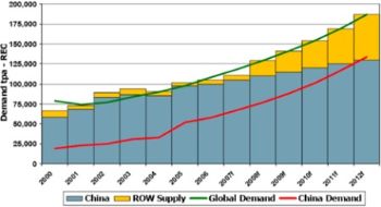 La natura del problema è forse meglio indicata dal secondo grafico – la domanda confrontata con la produzione – da cui si vede che per il 2012 si prevede che la domanda cinese, che negli anni passati è stata molto al di sotto della produzione, uguaglierà la produzione.