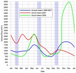 Il dato importante che viene monitorato è la quantità di acqua che i fiumi portano in mare e viene misurata in metri cubi al secondo (mc/s) riferito a ciascuno fiume. Per avere un’idea dell’evento di piena dell’autunno del 2000 basta indicare pochi dati. Si sono osservate portate massime di 9600 mc/s (22 ottobre), con una media nei due mesi di ottobre e novembre di circa 5000 mc/s contro una media pluriannuale dello stesso periodo di circa 2000 mc/s.