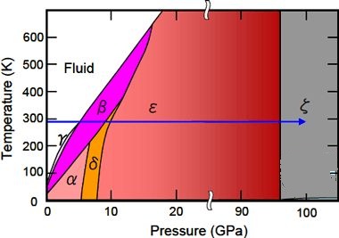 Figura 1. Diagramma di stato dell’ossigeno. Notare le numerose fasi, a seconda della temperatura e della pressione. Ad alta pressione è possibile avere ossigeno solido anche a temperatura ambiente (~300 K) mentre a pressione atmosferica è solido solo sotto i 54,8 K [-218.3 °C]. La fase (grigio) presenta carattere metallico la trasformazione avviene a 96 GPa.