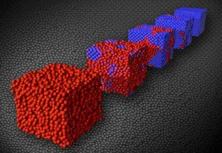 Foto: Passaggio graduale da un solido perfettamente disordinato (rosso) a un cristallo perfetto (blu). (Credit: University of Pennsylvania)