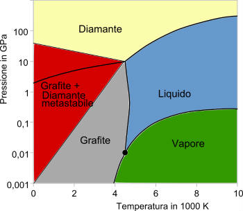 Il carbonio puro si presenta in due forme cristalline: la grafite e il diamante. La grafite è la forma stabile, a temperatura e pressione ambiente, mentre il diamante è la forma stabile a pressioni superiori a 50.000 atmosfere (vedi il grafico qui sotto).
