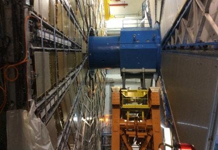 Il gran finale della visita è la discesa nella “caverna” di Atlas che, come tutto l’acceleratore, è un impianto sotterraneo. Scendiamo a 93 metri di profondità, dove è collocata un’apparecchiatura dalla forma complessiva di un grande cilindro orizzontale, lungo 46 metri, con un diametro di base di 25 metri e un peso totale di 7000 tonnellate. Dalla nostra postazione possiamo vedere una delle due estremità, dove ci sono i grandi i rivelatori di muoni: è un’impressionante insieme di contenitori, tubi, quadri, interruttori, connettori, sistemi di sicurezza e un enorme quantità di cavi (anche se quelli che vediamo sono una piccola parte dei 3000 km del cablaggio totale di Atlas).