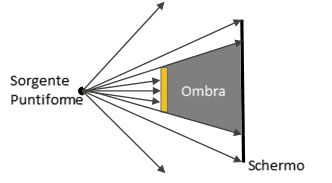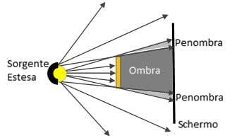 Per questa loro proprietà di ostacolare il passaggio della luce, i corpi opachi generano le ombre. Si tratta di una conseguenza del fatto che i raggi luminosi propagano nell’aria lungo traiettorie rettilinee e quindi non riescono ad aggirare gli ostacoli che incontrano sul loro percorso. In realtà, poiché la luce è anche un fenomeno ondulatorio – si comporta cioè anche come un’onda – una piccola porzione riesce a superare l’ostacolo (fenomeno della diffrazione) ma, siccome si tratta di un contributo minimo e poco visibile, per il momento possiamo ignorarlo. Tuttavia, anche trascurando questo effetto, se ci fate caso i bordi delle ombre non appaiono mai netti ma sempre un po’ sfumati. Questo succede perché le sorgenti luminose che usiamo normalmente – a esclusione dei laser – non sono mai puntiformi (cioè così piccole da essere assimilate a un punto) ma occupano una certa regione spaziale. Per questo motivo, i raggi luminosi da loro emessi non provengono dallo stesso punto ma da punti diversi della loro superficie. Di conseguenza, alcuni di questi raggi riescono a superare l’ostacolo, formando così una zona di penombra (vedi figura).