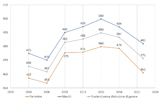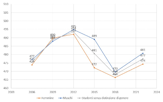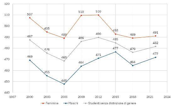Per quanto riguarda la differenza di genere, nel 2022 le ragazze italiane hanno superato i ragazzi italiani di 19 punti. Osservando i dati delle rilevazioni passate, il significativo divario di genere osservato nei primi anni di PISA si sta riducendo, sebbene sia ancora lontano dalla parità.