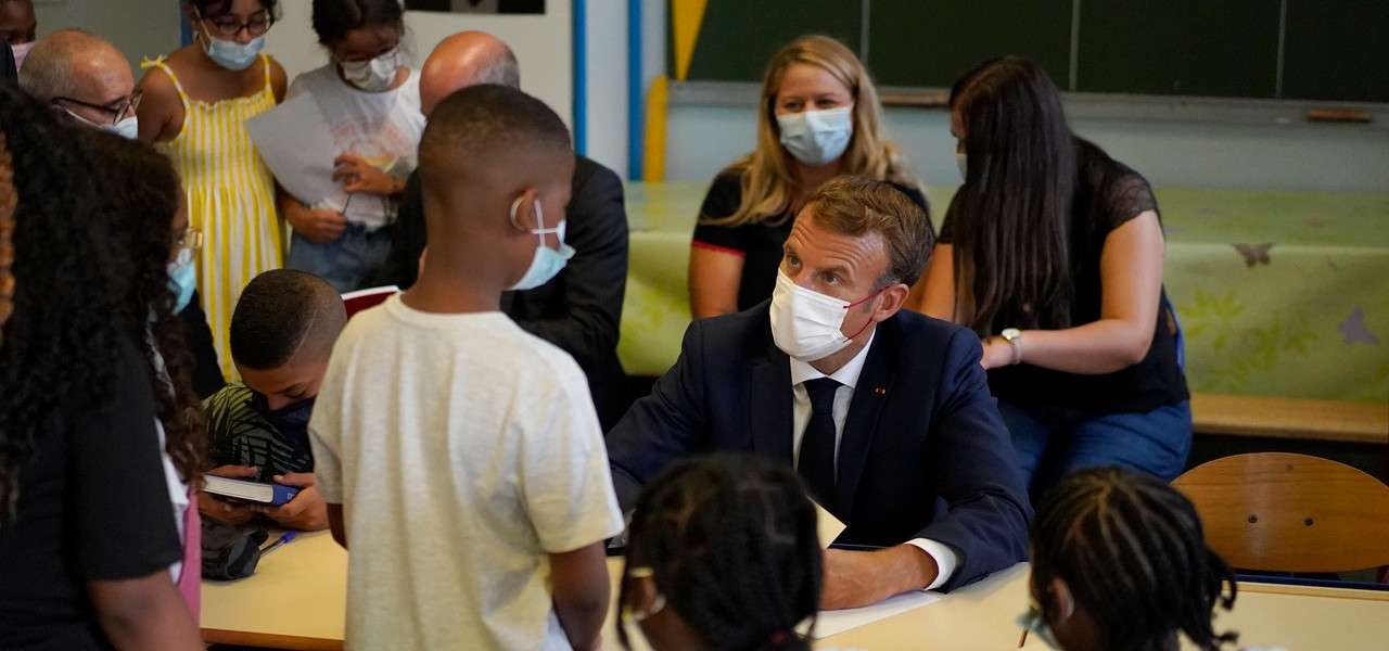 Il presidente francese Emmanuel Macron in una scuola di Marsiglia (LaPresse)