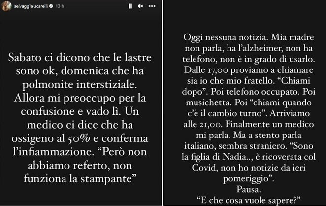 Nelle ultime ore Selvaggia Lucarelli si è resa protagonista di uno sfogo che riguarda un aspetto della sua vita privata. Sua mamma Nadia si trova da diverso tempo in una rsa di Milano. Di recente ha però contratto il Covid ed è stata trasportata a Sesto San Giovanni, al Multimedica per la quarantena. La giornalista ha però denunciato su Instagram, con una serie di post, di non ricevere notizie sulle condizioni di salute della madre.