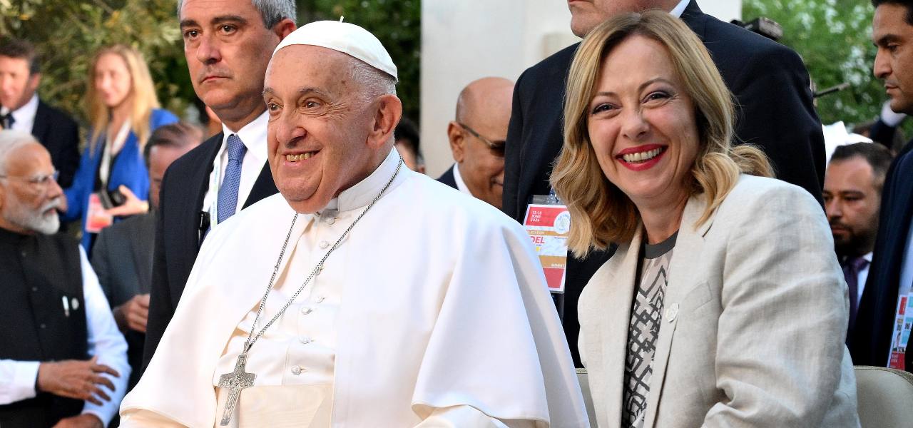 Papa Francesco con la Premier Giorgia Meloni al G7 in Puglia nel giugno 2024 (ANSA, Ettore Ferrari)