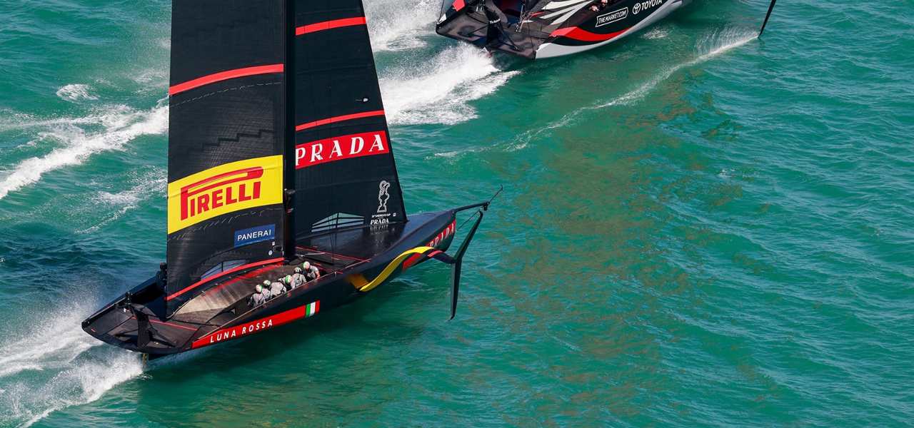 Poi ci sono le immagini: un campo di gara dove ci si immagina che, per vincere, occorra seguire il percorso più breve per arrivare primi. E invece no: le inusuali imbarcazioni, invece di andare dritto, si tagliano la strada senza soluzione di continuità, in un vorticoso e (ai profani della vela) incomprensibile zig-zag, che nei primi tre giorni di regata ha decretato un pareggio: una vittoria per New Zealand, una per la barca di Prada (o Prada Pirelli, o fate voi) in un “appassionante” (ca va sans dire) 3-3 che faceva presagire un arrivo al fotofinish da cardiopalma.