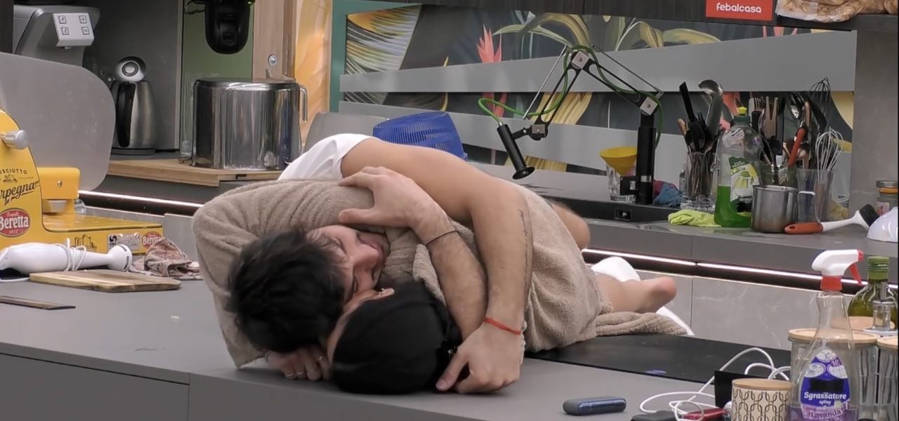 Il riferimento è all’ultimo chiarimento che hanno avuto: Lorenzo Spolverato era seduta sulla penisola della cucina mentre la fidanzata Shaila Gatta pranzava, quindi hanno deciso di stringersi in un abbraccio per sancire la ritrovata pace. Dall’abbraccio, però, si è andati oltre: le immagini mostrano la ballerina distesa sulla penisola, in costume da bagno e con l’accappatoio aperto, mentre il fidanzato che la riempie ovunque di baci.