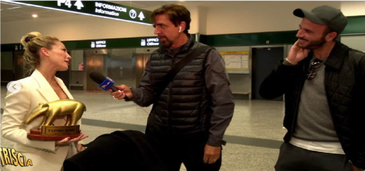 Con la sua solita ironia, Valerio Staffelli ha consegnato il tapiro d’oro a Silvia Slitti e a Giampaolo Pazzini rivolendo alla coppia una serie di domande proprio su Ambra Angiolini. «Lei cantava “se prometto poi mantengo”, ma evidentemente era una promessa senza data», dichiara ironicamente Slitti che poi aggiunge . «Quando devo venire a Milano per lavoro devo andare a dormire in albergo», conclude.