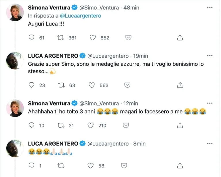 Simona Ventura ha regalato al popolo di Twitter un momento di grosse risate. La celebre conduttrice è stata infatti la protagonista di una gaffe che è diventata virale quando ha deciso di fare i suoi auguri a Luca Argentero. L’attore, con un tweet, ha gioito del risultato italiano alle Olimpiadi di Tokyo, ricordando a tutti che sono state ben “40” le medaglie vinte. Così, nel suo messaggio, è apparso il numero affiancato da alcune emoticon emozionate per questo trionfo. La Ventura, tuttavia, non ha inteso che si trattasse delle medaglie italiane, immaginando invece fossero gli anni che l’attore si apprestava a festeggiare. Così è arrivato il messaggio di auguri. Sono bastati pochi minuti perché Argentero si accorgesse della gaffe e rispondesse alla Ventura, facendole presente l’errore commesso.