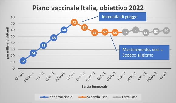 La simulazione di un piano vaccinale senza AstraZeneca, ma con l'apporto di Johnson&Johnson, e l'uso del vaccino italiano. L'immunità viene raggiunta nel 2022