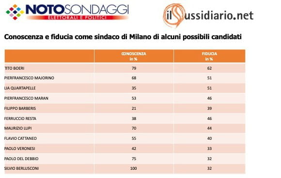 Nel sondaggio si è inserito anche Silvio Berlusconi. Si è parlato in queste settimane di una sua candidatura per il Comune di Milano e quindi non è stata una scelta campata per aria. Berlusconi raggiunge il tetto assoluto della notorietà (100%) – sorte simile toccata a Napoli a Bassolino – ma poi crolla nella fiducia (solo uno su 3) e per la diffusa sensazione che Milano con lui sindaco può solo tornare indietro.