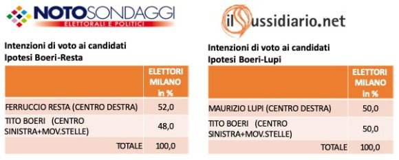 Nei principali scontri diretti, simulando un eventuale ballottaggio, Boeri, il miglior candidato del centro-sinistra, pareggia con Lupi (50% a 50%) e perde di misura con Resta (48% a 52%). Tutti gli altri match sono vinti dai candidati del centro-destra.