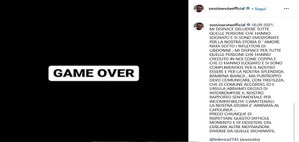 “Mi dispiace deludere tutte quelle persone che hanno sognato e si sono emozionate per la nostra storia d’amore nata sotto i riflettori di Uomini e Donne; mi dispiace per tutte quelle persone che hanno creduto in noi come coppia e che ci hanno elogiato e si sono complimentate per il nostro essere e per la nostra splendida bambina Bianca, ma purtroppo devo comunicare, con tristezza, che di comune accordo, io e Ursula abbiamo deciso di interrompere il nostro rapporto sentimentale per incompatibilità caratteriali“, scrive Sossio.