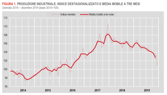 E ora arriviamo a noi, al presente, al nostro Paese. La situazione non migliora e fa eco alle sopracitate rilevazioni. Anche la produzione industriale italiana evidenzia una pesante flessione e Istat, attraverso il consueto comunicato, ne ha certificato l’entità: «A dicembre 2019 si stima che l’indice destagionalizzato della produzione industriale diminuisca del 2,7% rispetto a novembre, mentre per l’indice corretto per gli effetti di calendario si stima una flessione, in termini tendenziali, del 4,3%». Nel medesimo rapporto, il denominato “Commento” ci riporta al passato: «Nel complesso del 2019 la produzione industriale ha mostrato una diminuzione rispetto all’anno precedente, la prima dal 2014». Un passo indietro di cinque anni.